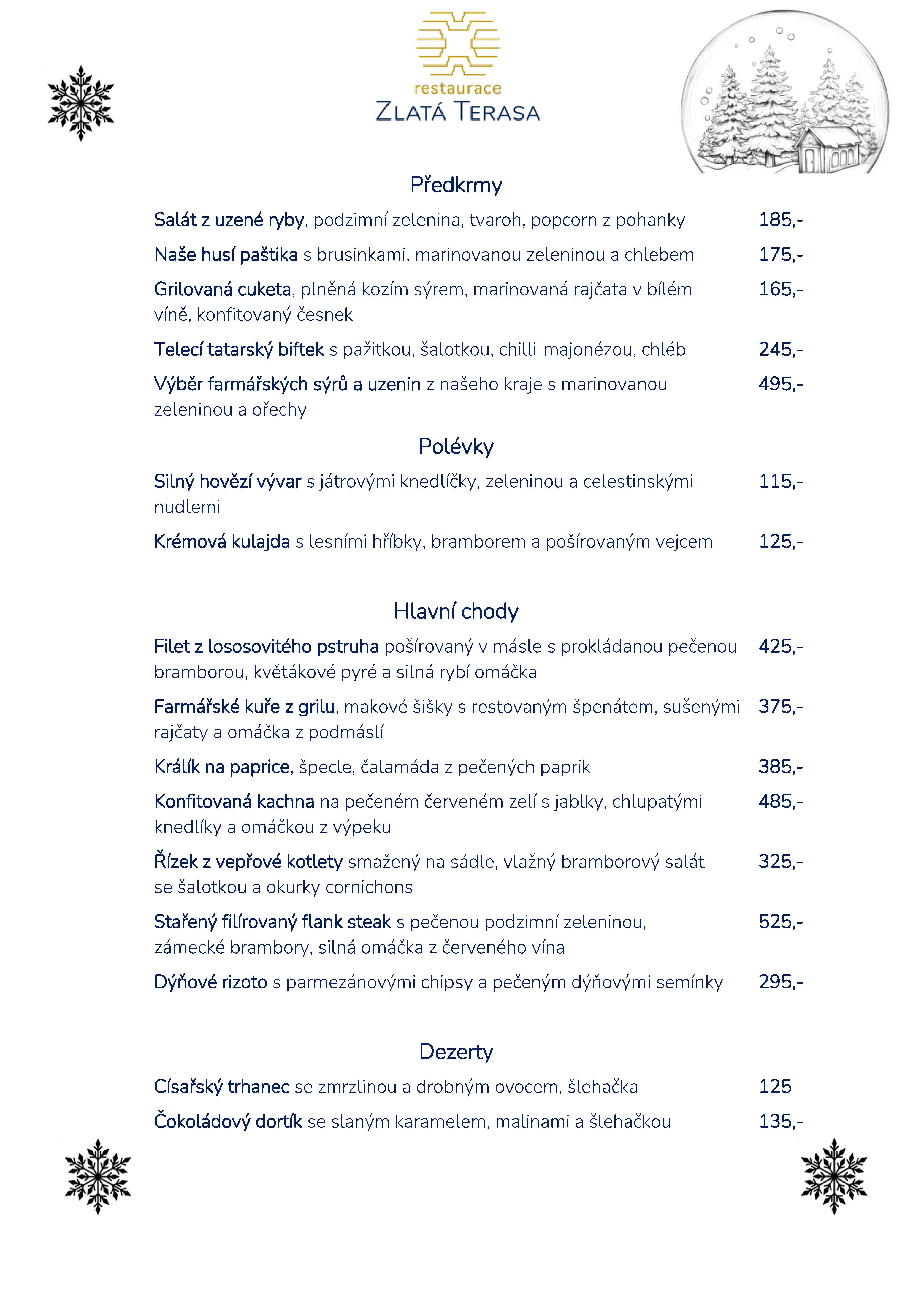 Restaurace Zlatá terasa je místo, kde Vám dopřejeme ty pravé gastronomické zážitky. Její součástí je prostorná zámecká terasa s výhledem do bylinkové zahrady a zámeckého parku.